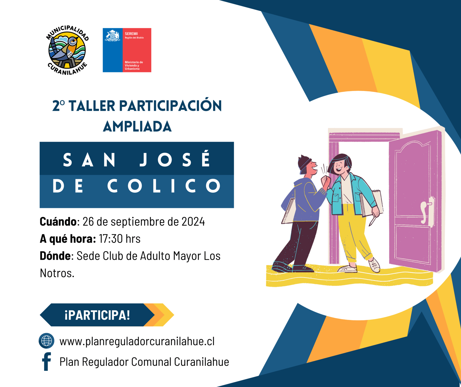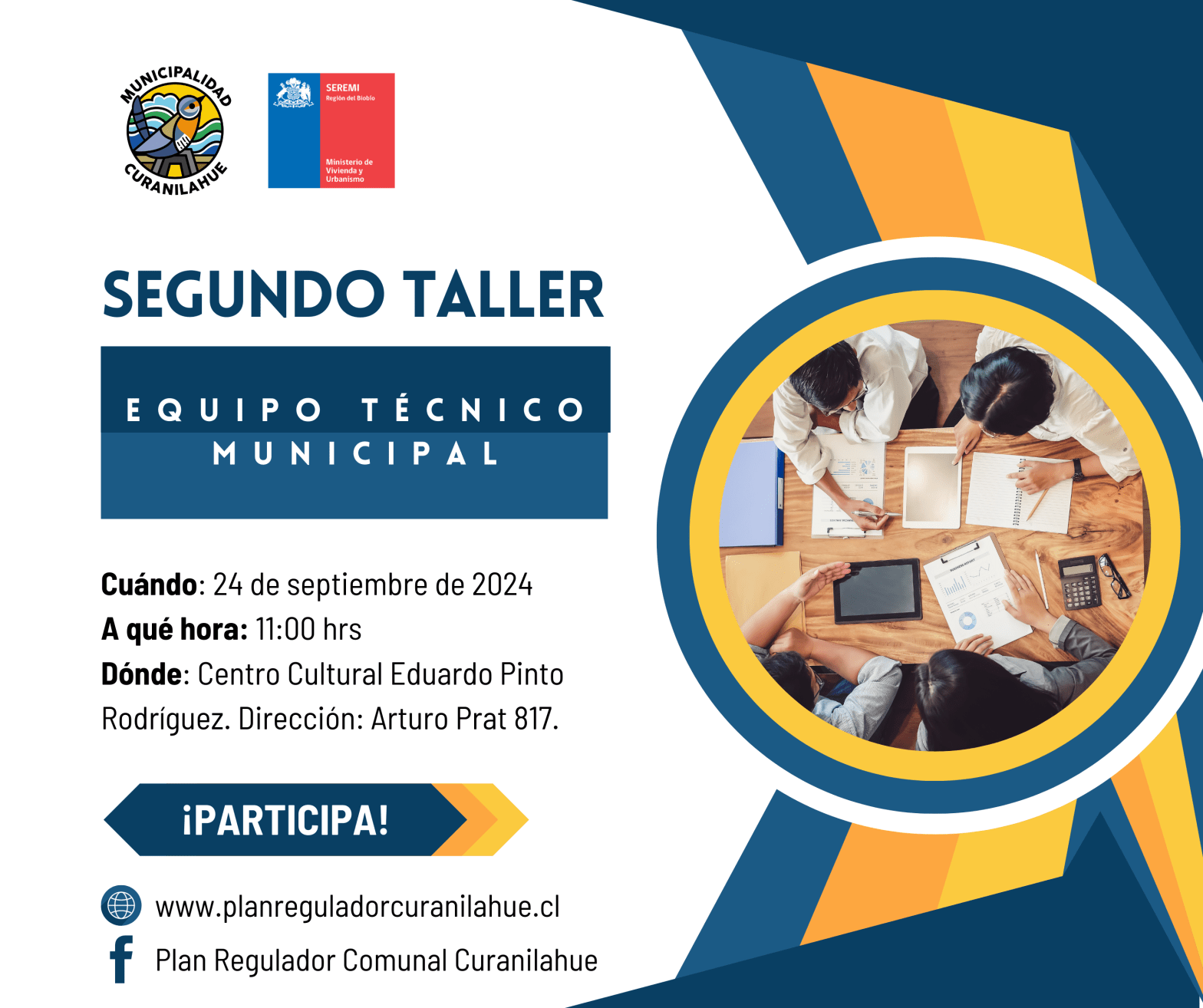 El 24 de septiembre y el 2 de octubre a las 17:30 hrs, ven a formarte en planificación urbana en el Salón del Concejo Municipal. ¡Tu conocimiento puede transformar nuestra comuna!